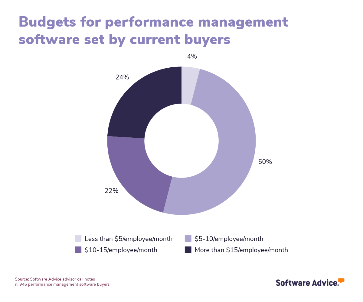 As you might expect, the biggest component baked into the price of any new software system is going to be the license cost. That’s no different for performance management software, where the license cost most often scales based on the number of employees you have and the level of functionality offered. For context, half of the buyers requesting performance management software that our advisors have spoken to in the past year budgeted between $5 and $10 per employee, per month for this cost.