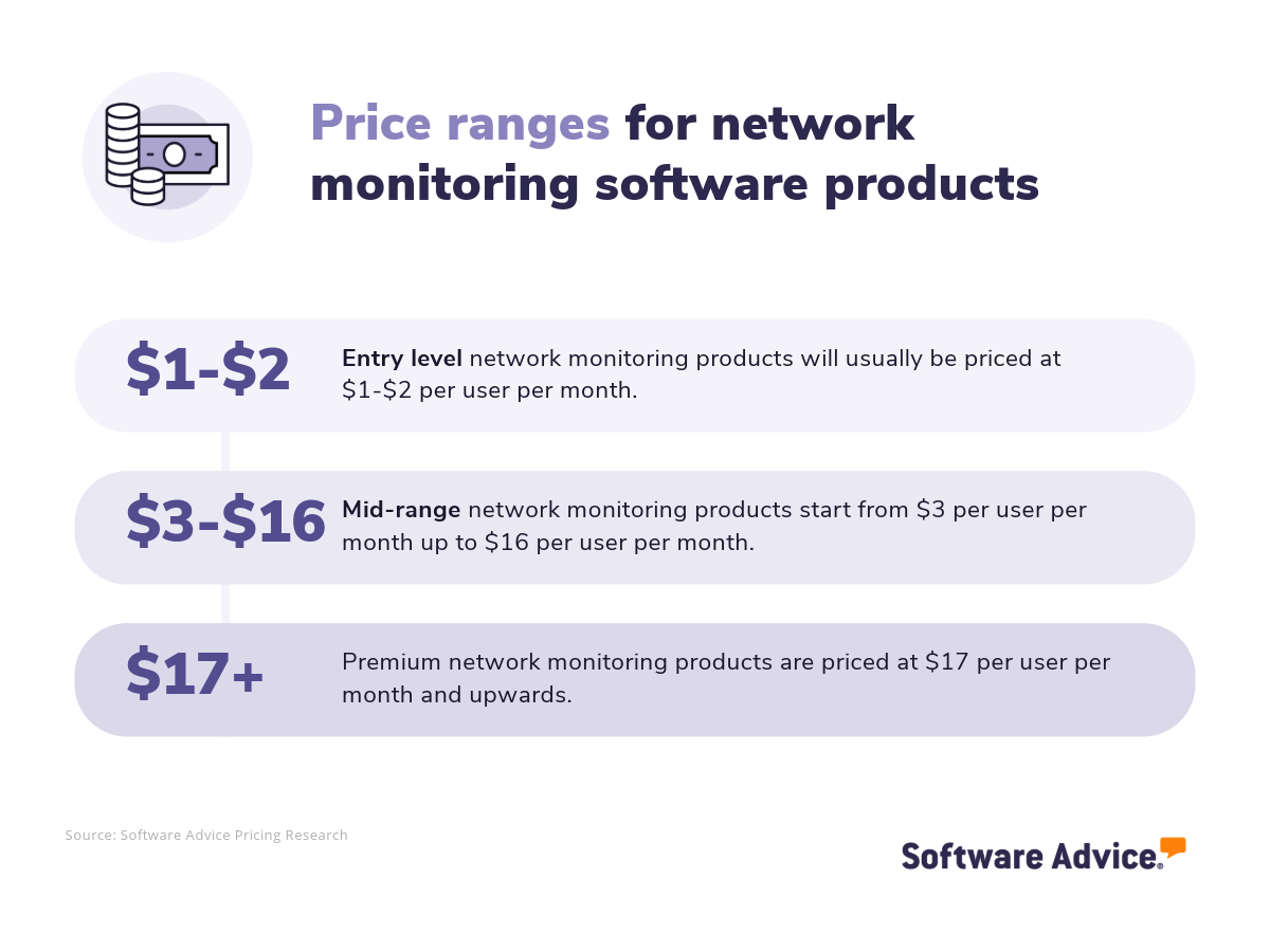 Network monitoring software is usually priced per user per month. The price varies depending on the type of system you choose, with entry-level systems costing $1-$2 per user per month. Buyers of mid-level systems can expect to pay $3-$16 per user per month, and for premium platforms, the price is usually $17 per user per month or above.