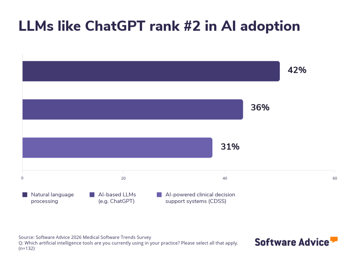 36% of medical software users already use AI-based large language models (LLMs) like ChatGPT in their practice, the second-highest adoption rate after NLP for documentation.