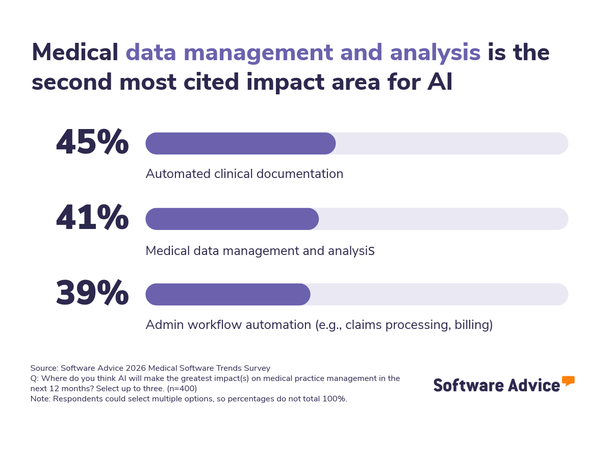 Data management and analysis is the second most common way AI could impact medical practice management, according to survey respondents. As practices accumulate more data but lack dedicated analysts, AI fills the gap between having data and using data effectively.