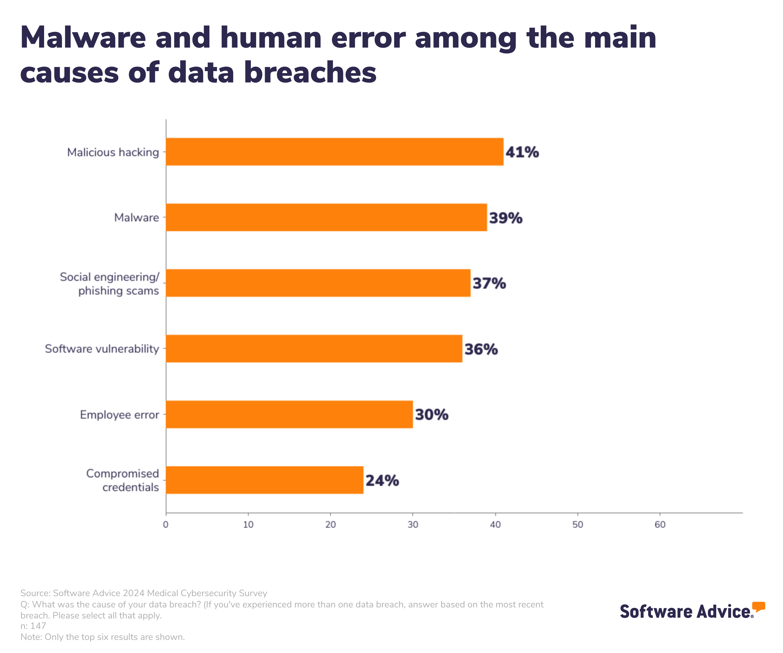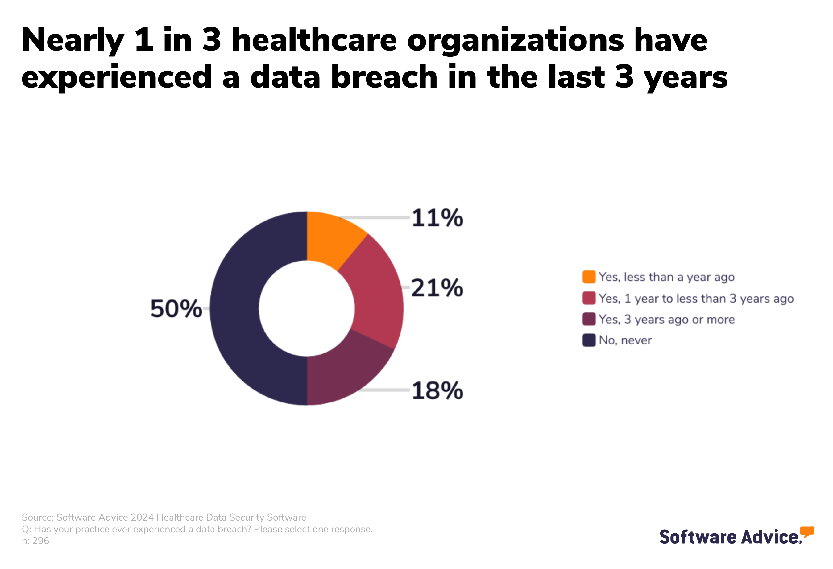 *Software Advice’s 2024 Medical Cybersecurity Survey was conducted online in March among 296 respondents working at healthcare organizations in the U.S. to learn how medical practices are fighting back against cyber threats. Respondents were screened to have IT management, data security, data management, or security training or audit responsibilities. Organizations that outsource 100% of their IT management or cybersecurity needs were excluded from participating.