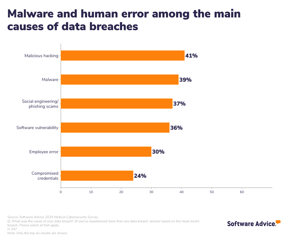 One of the most common causes of healthcare data breaches is hacking or IT incidents. In fact, malicious hacking (41%), malware (39%), phishing scams (37%), and software vulnerability (36%) result in the largest percentages of data breaches based on our survey.
