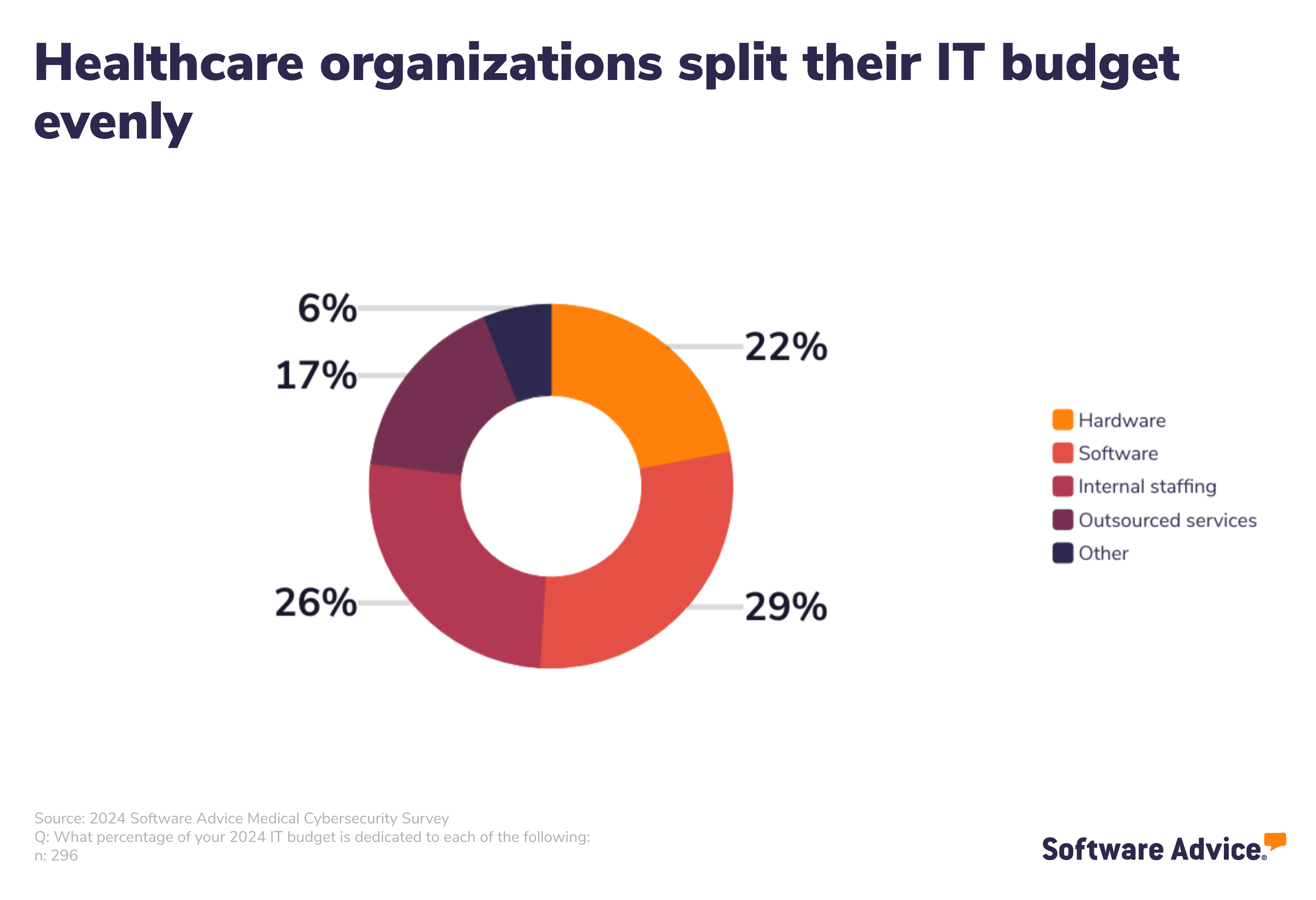 Software Advice’s 2024 Medical Cybersecurity Survey was conducted online in March among 296 respondents working at healthcare organizations in the U.S. to learn how medical practices are fighting back against cyber threats. Respondents were screened to have IT management, data security, data management, or security training or audit responsibilities. Organizations that outsource 100% of their IT management or cybersecurity needs were excluded from participating.