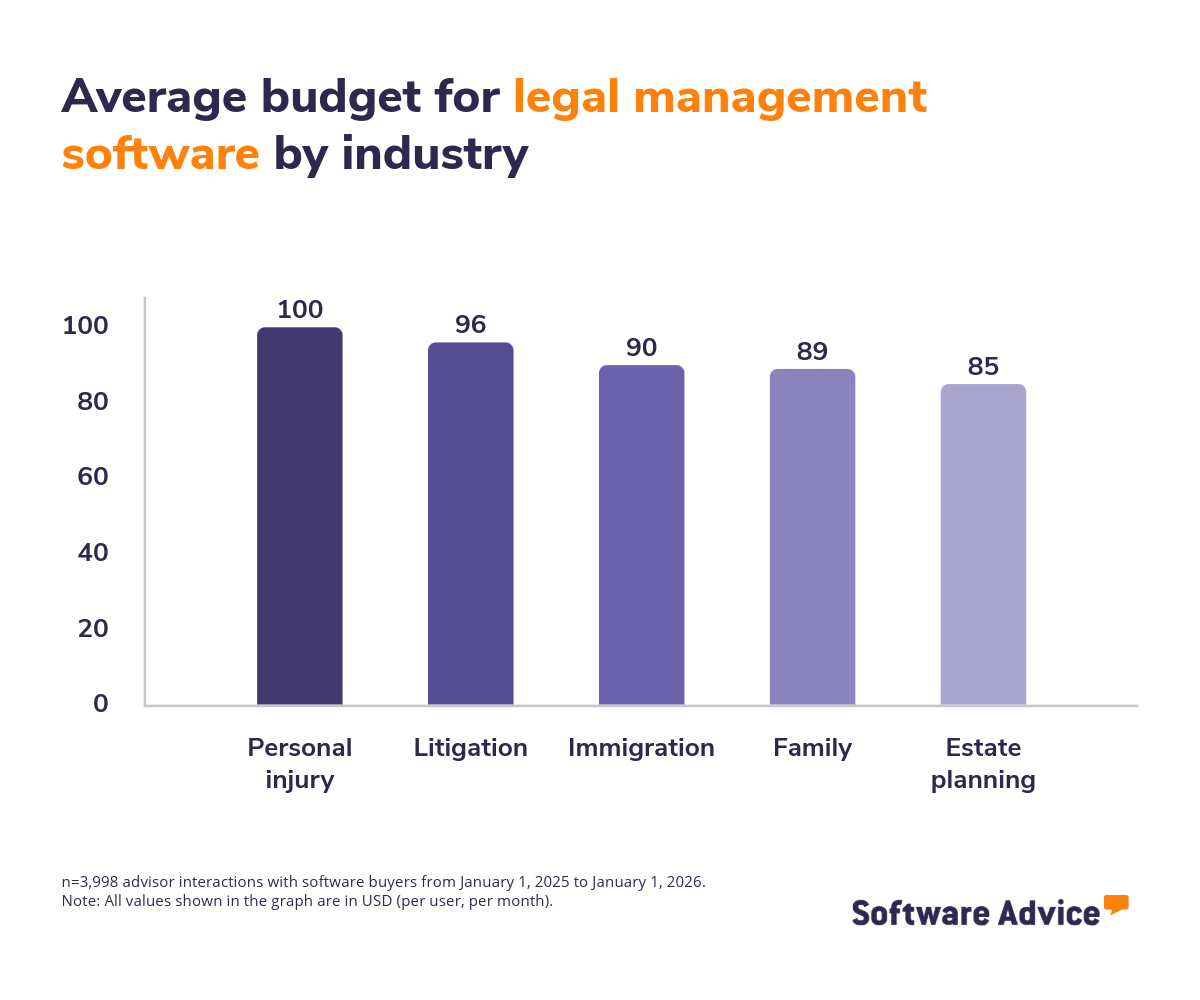 The budget for purchasing legal management software varies from one industry to another based on your feature requirements, user count, deployment model, and integration needs. However, based on our advisors’ interactions, the average budget across industries for purchasing legal management software was approximately $93 per user, per month.
