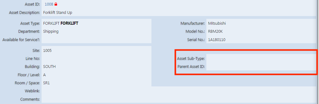 eMaint X3 asset profiles include fields for the equipment’s subcomponents and parent assets (Source)
