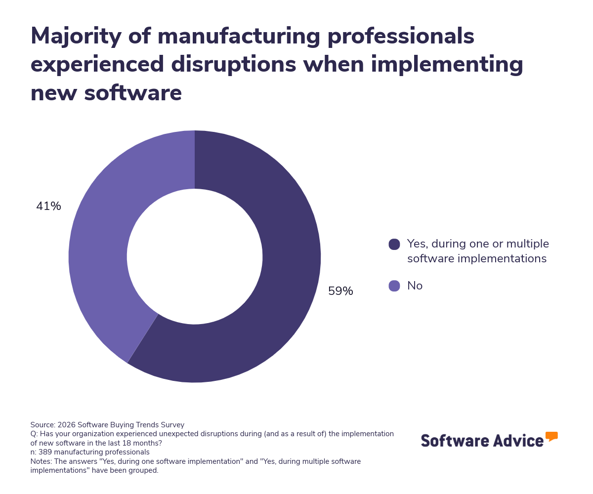 When manufacturing system integration is not properly planned, manufacturers face multiple negative outcomes, including project delays, budget overruns, and operational disruptions. Survey data indicates that 59% of manufacturers reported experiencing disruptions during software implementation in the past 18 months*. These disruptions are often caused by integration problems, data migration challenges, inadequate training, and insufficient vendor support.