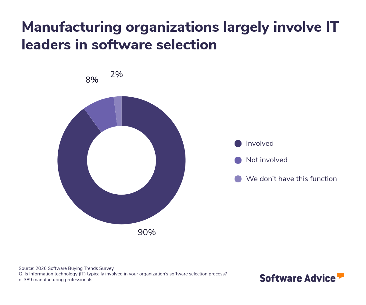 *Software Advice 2026 Software Buying Trends survey was conducted online in August 2025 among 3,385 respondents in Australia (n=281), Brazil (n=278), Canada (n=293), France (n=283), Germany (n=279), India (n=260), Italy (n=263), Mexico (n=288), Spain (n=273), the U.K. (n=299), and the U.S. (n=588), at businesses across multiple industries (including 389 respondents in manufacturing roles), ages (1 year in business or longer), and sizes (5 or more employees). Business sizes represented in the survey include: 1,676 small (5-249 full-time employees), 822 midsize (250-999), and 887 enterprise (1,000+). The goal of this study was to understand the timelines, organizational challenges, research behaviors, and adoption processes of business software buyers. Respondents were screened to ensure their involvement in business software purchasing decisions.