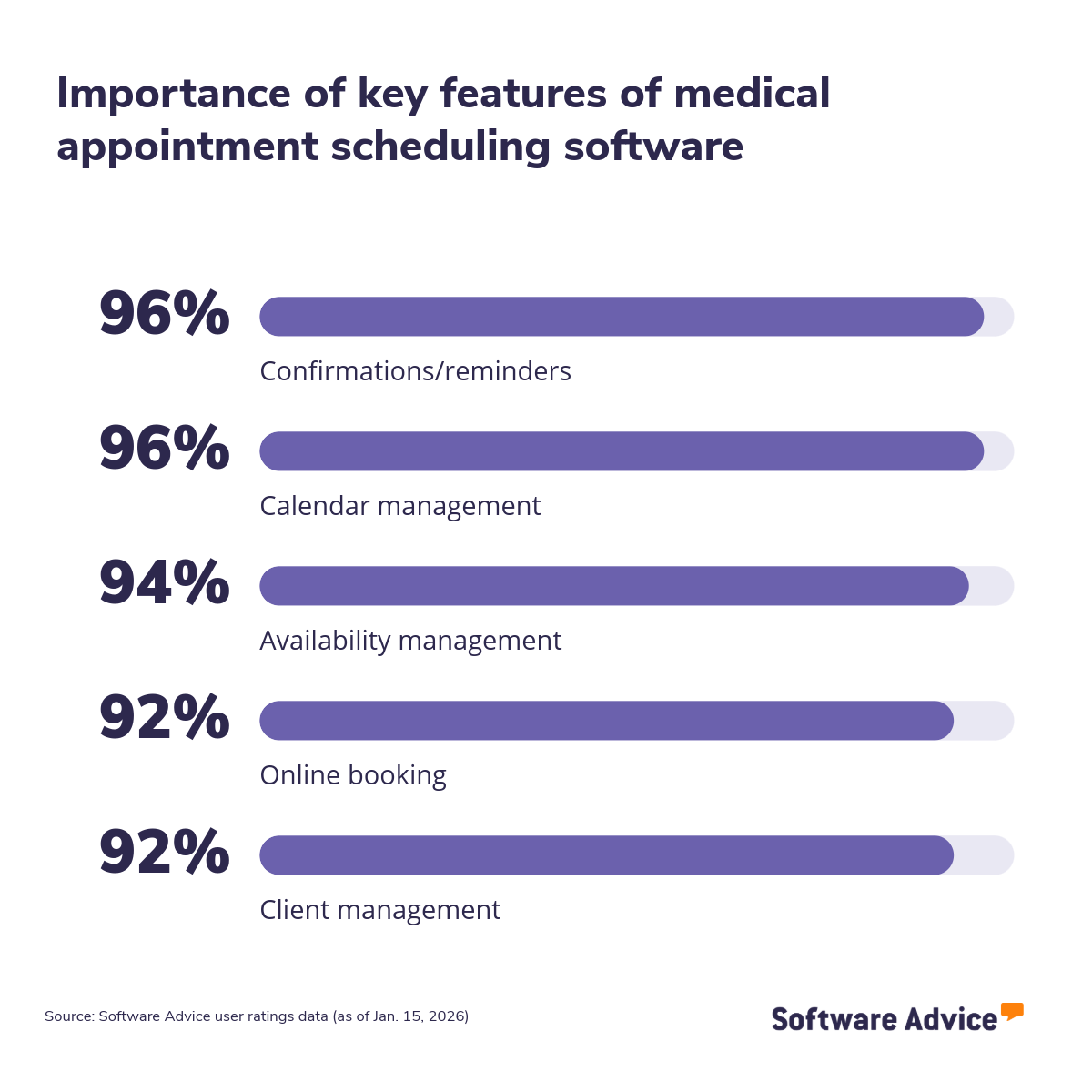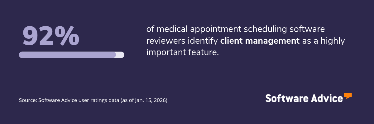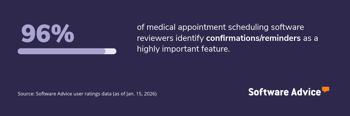 Key features: To identify the key features of this article, we asked users to rate each feature on a scale from “low importance” to “critical” for appointment scheduling software. The features showcased are those that the highest percentage of reviewers rated as “highly important” or “critical” over the past two years (as of Jan. 15, 2026).