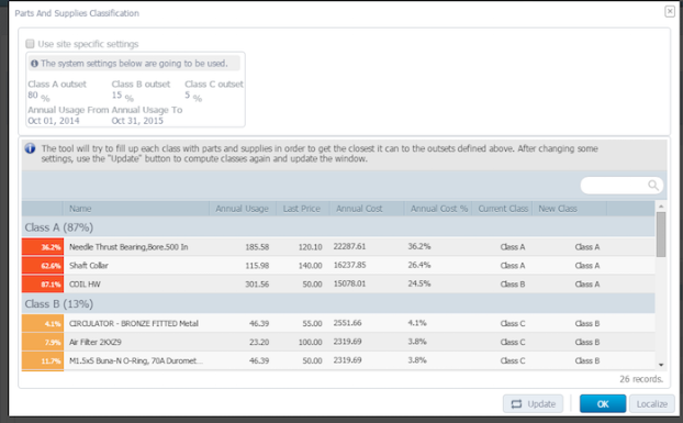 A CMMS can perform ABC and XYZ calculations for you. For example, in the screenshot below, users define annual usage percentages for A, B, and C classes of parts. The system then automatically organizes spare parts into each class based on usage.