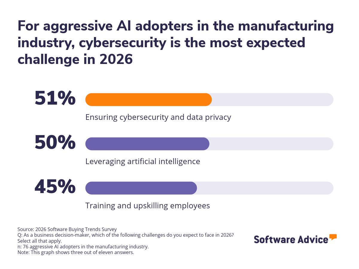 One of the most critical risks of AI adoption in manufacturing is the expansion of the cyberattack surface. 51% of aggressive AI adopters expect cybersecurity challenges in 2026.