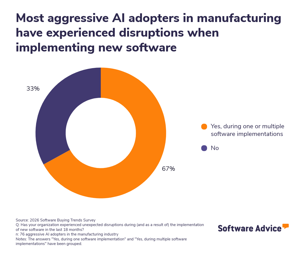 To understand the concrete risks faced by aggressive AI adopters in manufacturing, as well as strategies to maximize value while minimizing pitfalls, Software Advice has drawn insights from its 2026 Software Buying Trends Survey* of 3,385 manufacturing decision-makers.