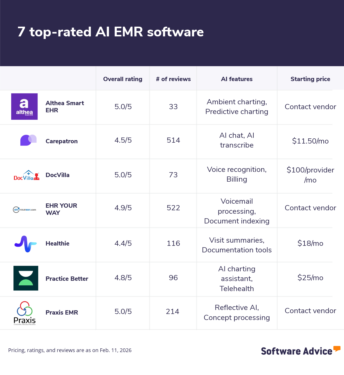 For the section titled “How much does AI EMR software cost?”, only products with publicly available pricing information and AI features, as of Feb. 11, 2026, were considered for pricing calculations.