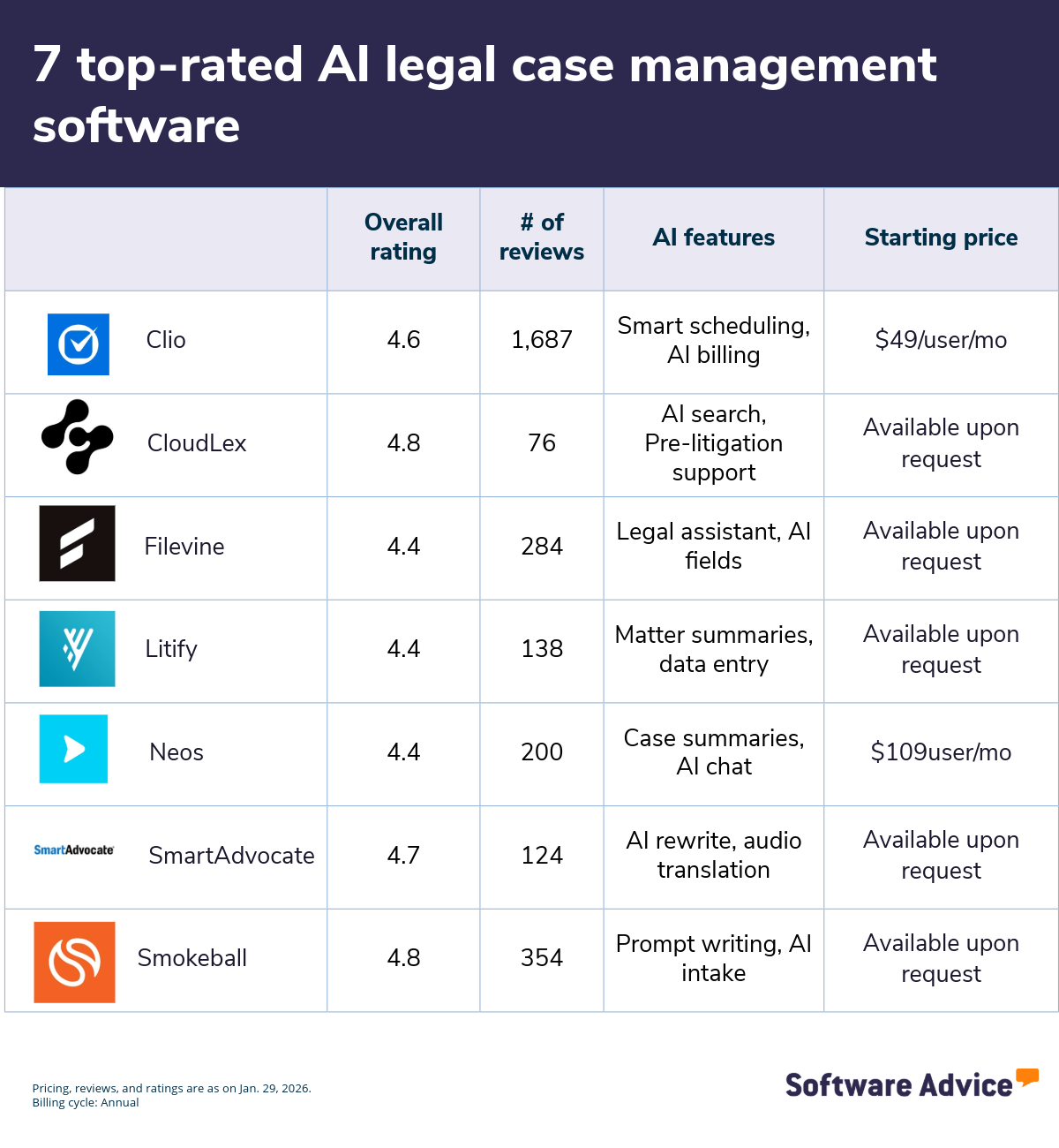 Why you should read on: To help you choose, here’s a list of the 7 top-rated AI legal case management software platforms, sorted alphabetically, based on verified user reviews. All of these tools offer essential case management features, including client management, document management, and billing and invoicing.