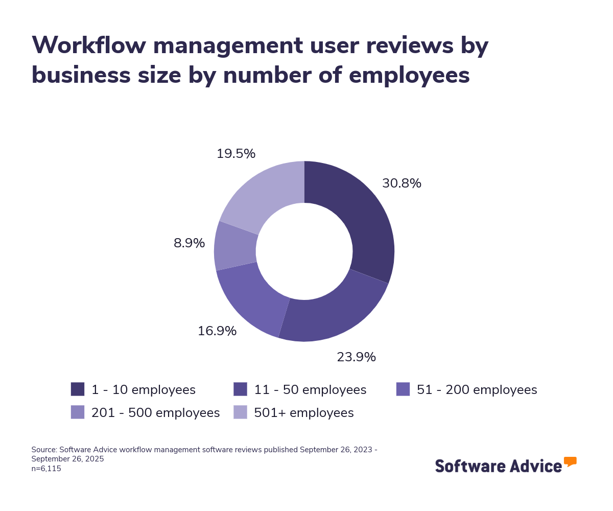 Software Advice advisor call notes: Findings are based on data from telephonic conversations that Software Advice’s advisor team had with businesses seeking workflow management tools. For this report, we analyzed phone interactions from September 2023 to September 2025. Read the complete methodology.